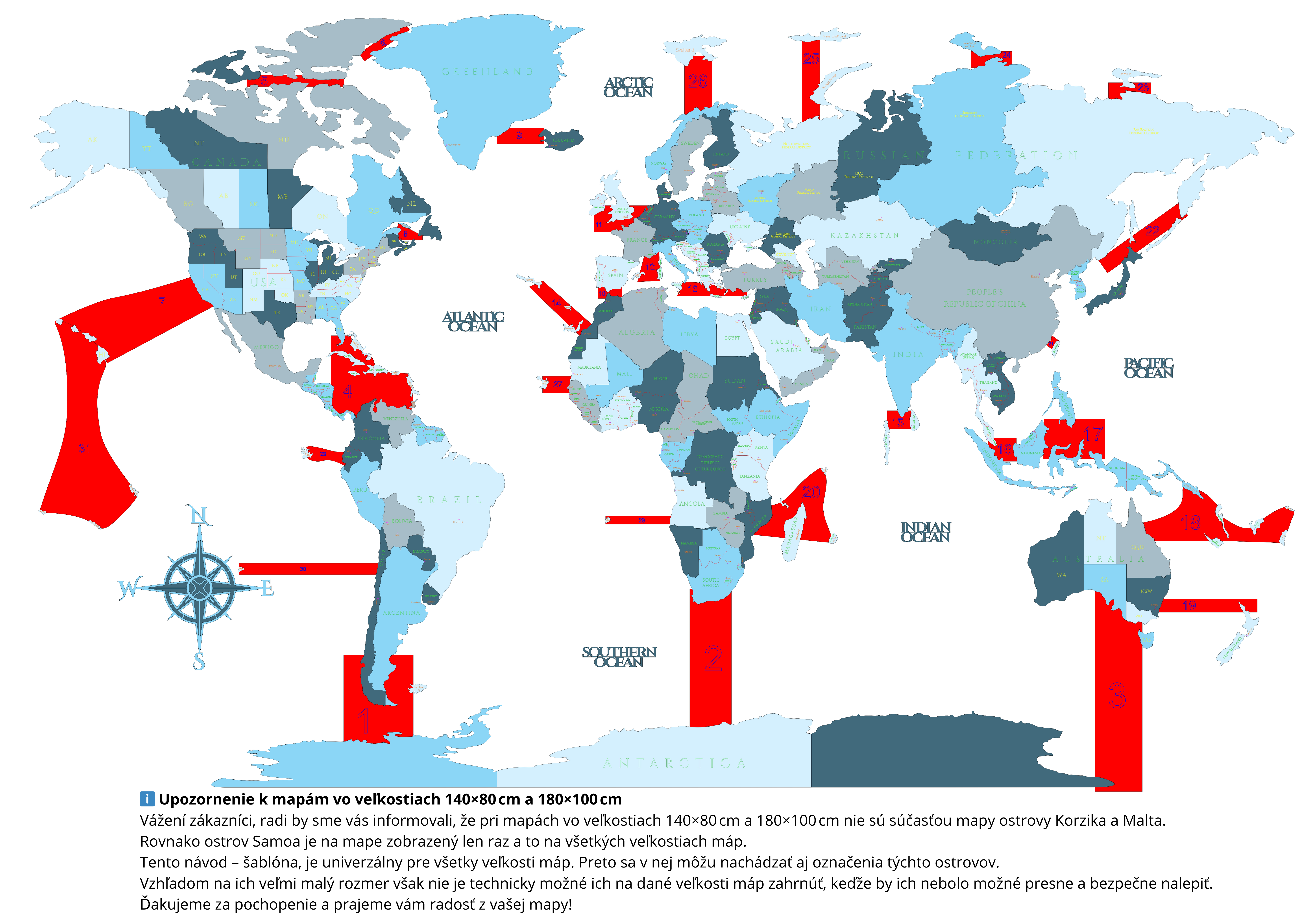 radi by sme vás informovali, že pri mapách vo veľkostiach 140×80 cm a 180×100 cm nie sú súčasťou mapy ostrovy Korzika a Malta. Rovnako ostrov Samoa je na mape zobrazený len raz a to na všetkých veľkostiach máp.