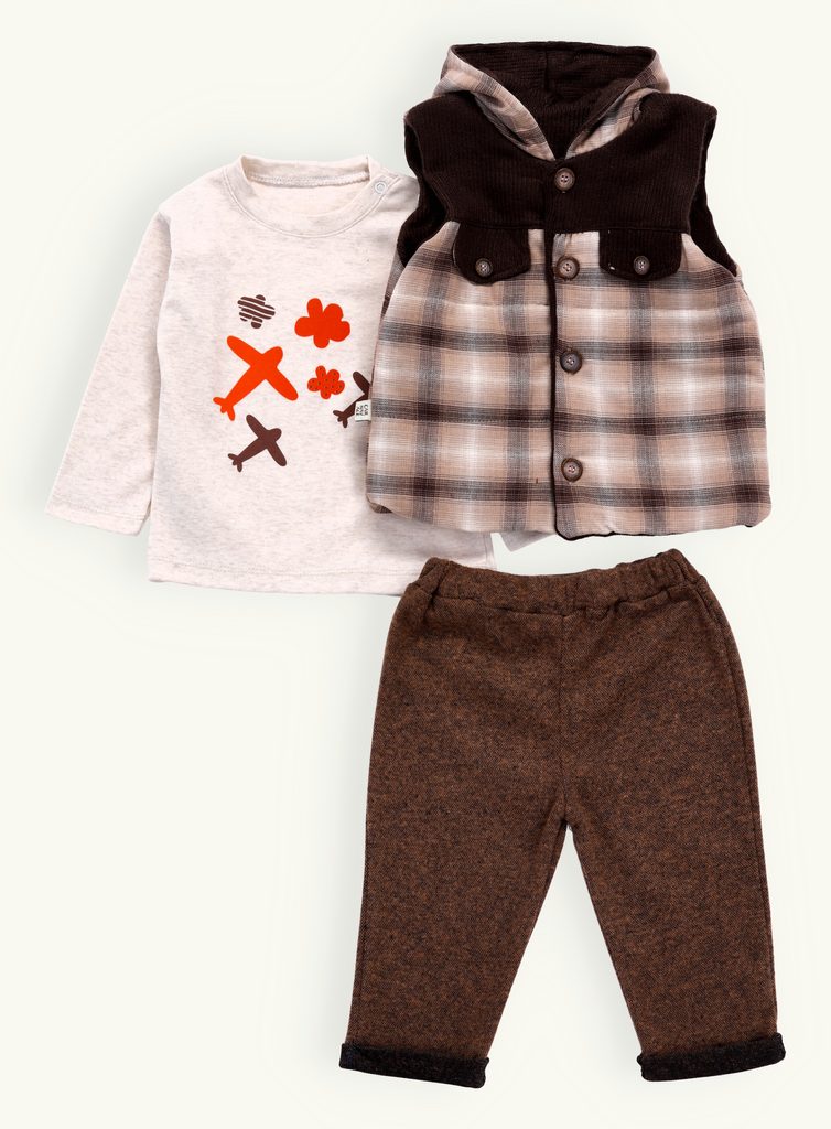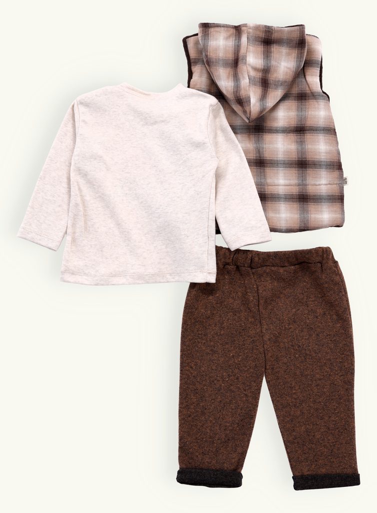 - vesta: károvaná s kapucňou, zapínanie na gombíky, dve predné ozdobné vrecká
