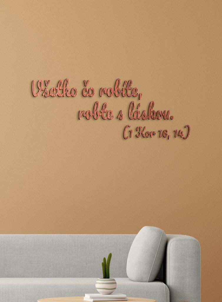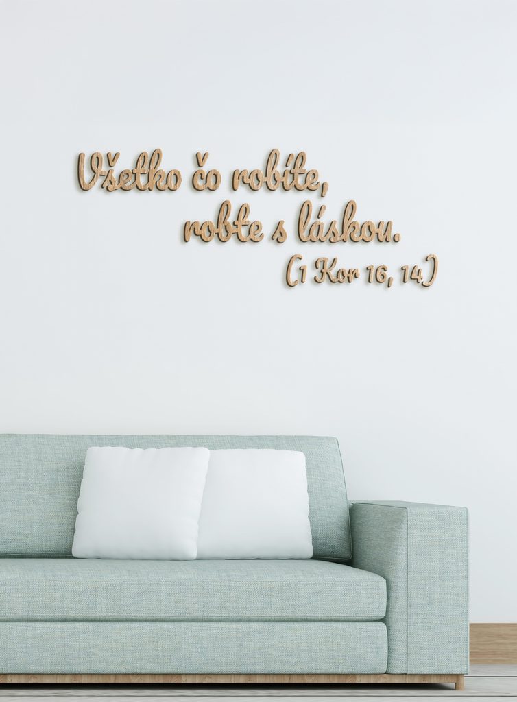 Nádherný drevený citát z HDF dreva, ktorý prinesie do vášho domova hlbokú a inšpirujúcu myšlienku z Biblie: "Všetko čo robíte, robte s láskou (1Kor 16,14)." Tento elegantný citát je starostlivo vyrezaný do kvalitného HDF dreva, pričom každý detail dodáva nápisu vizuálnu príťažlivosť a dlhú životnosť.
