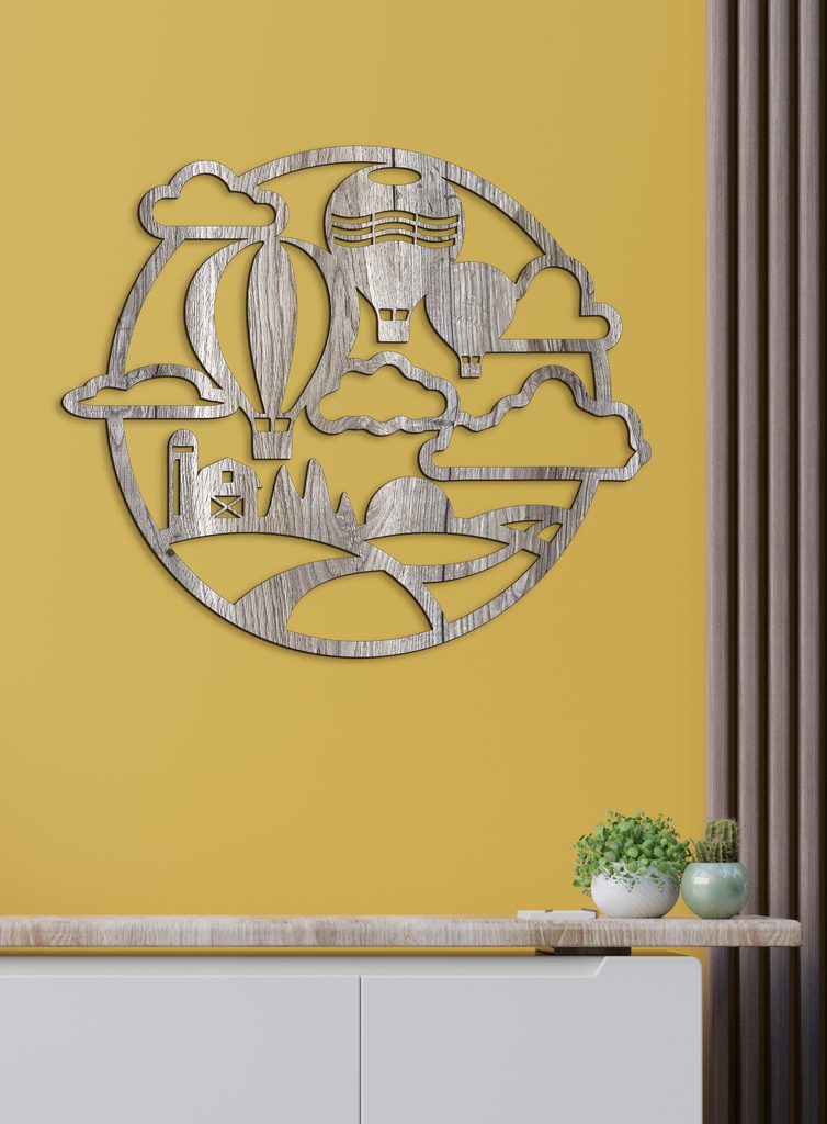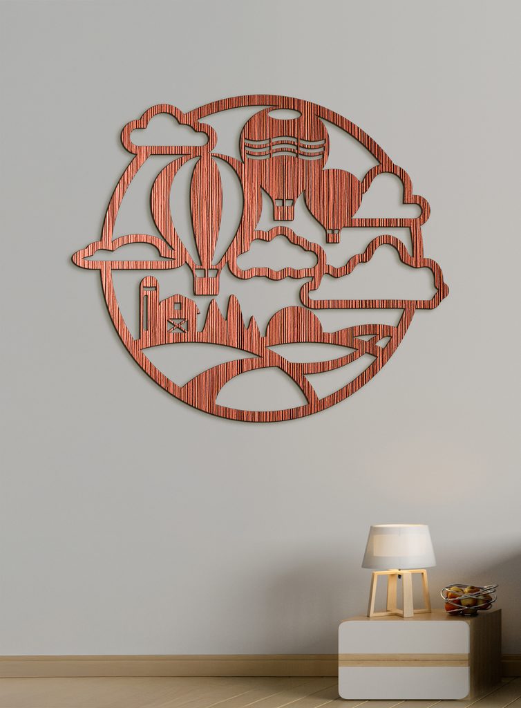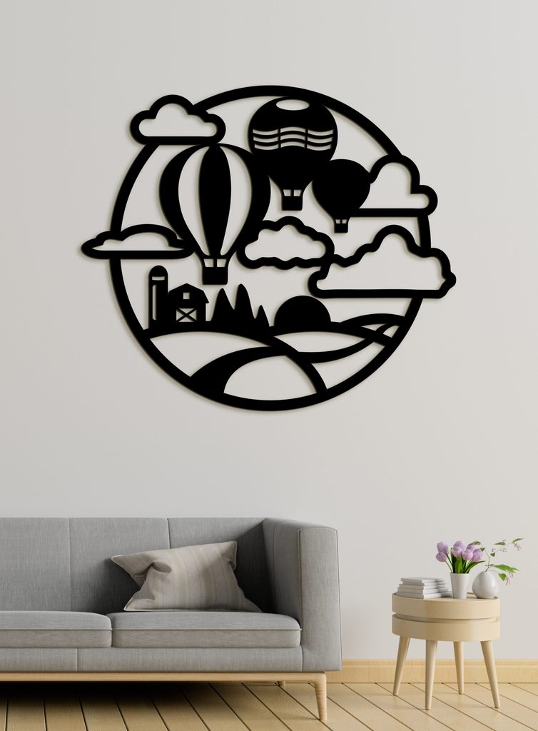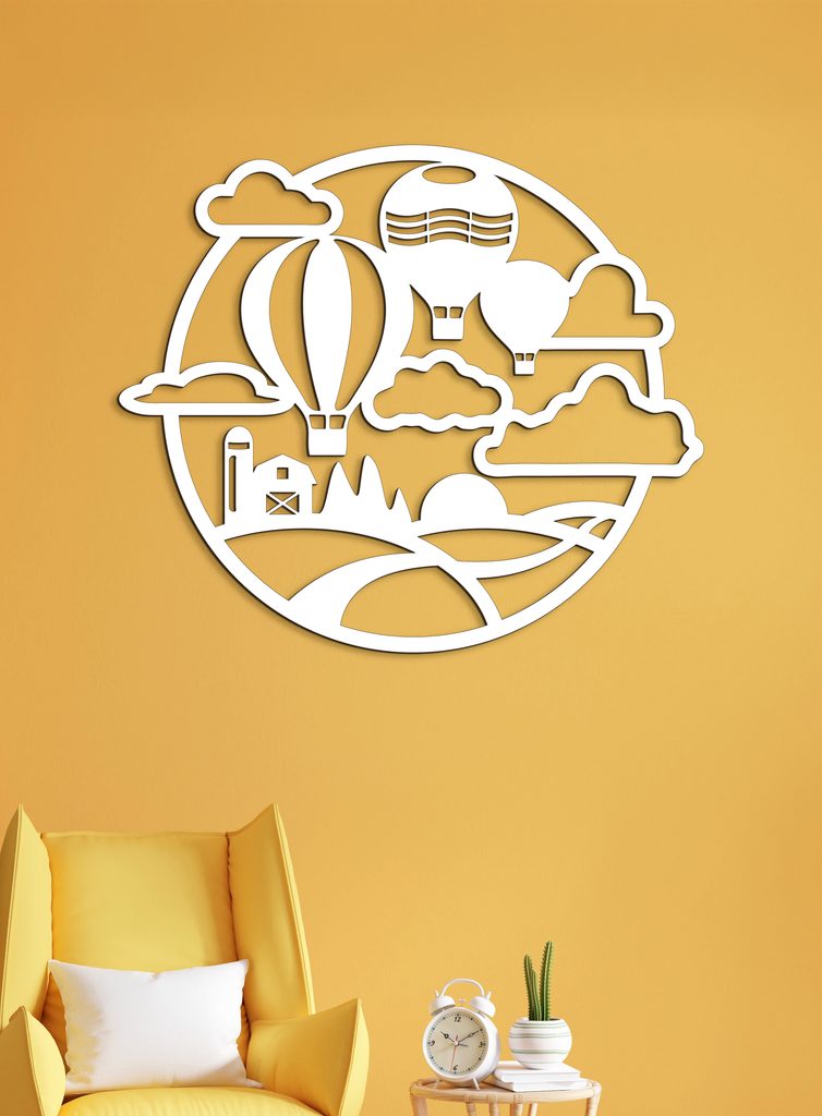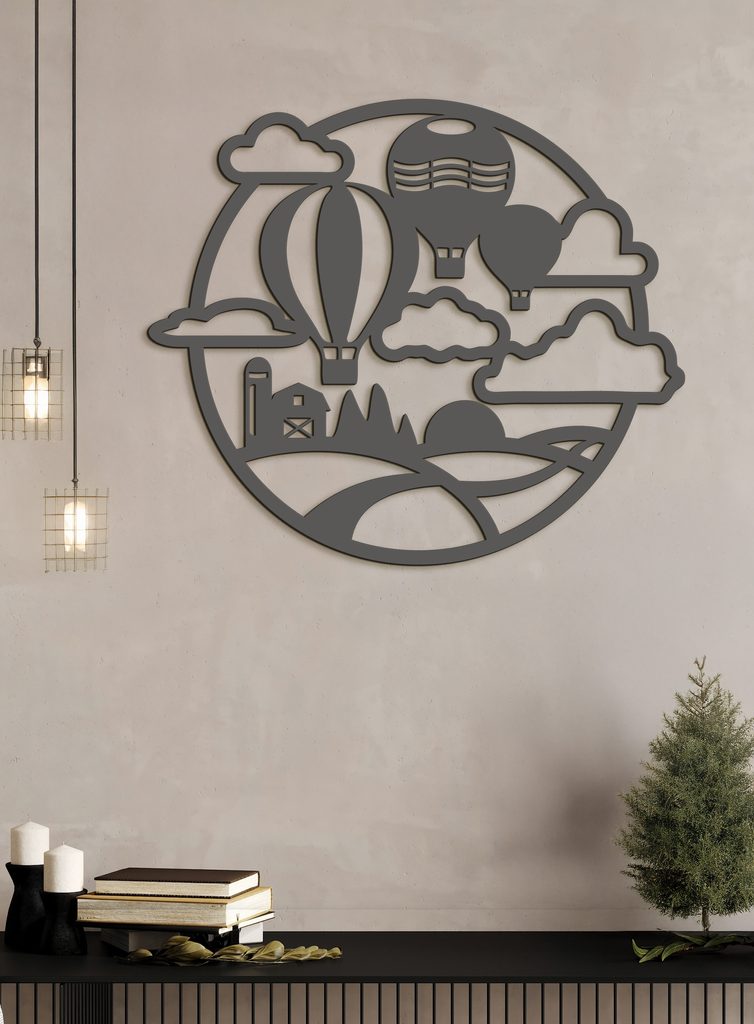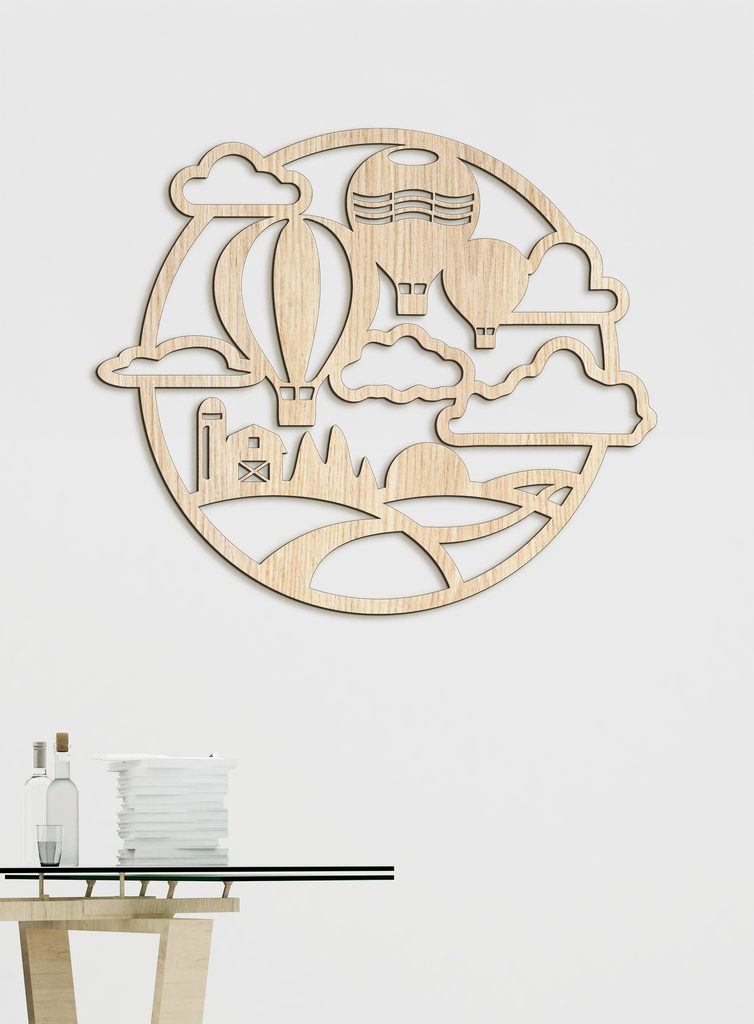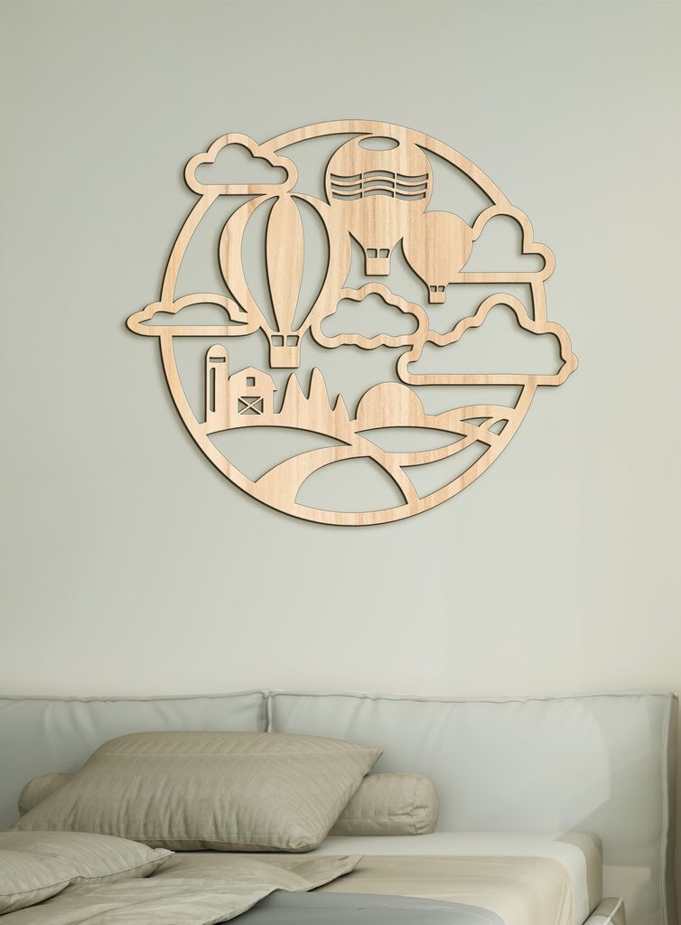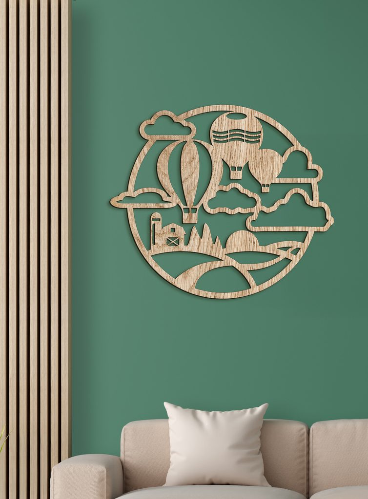 Predstavte si romantický let balónom nad nádhernou krajinou, zachytený v kruhovom drevenom dizajne. Tento jedinečný obraz z HDF dreva zobrazuje veľký balón plávajúci vysoko nad krajinou, s jemnými oblakmi a vzdialenými horami v pozadí.