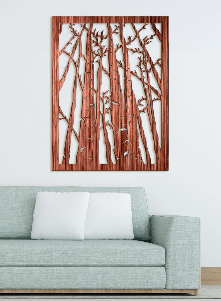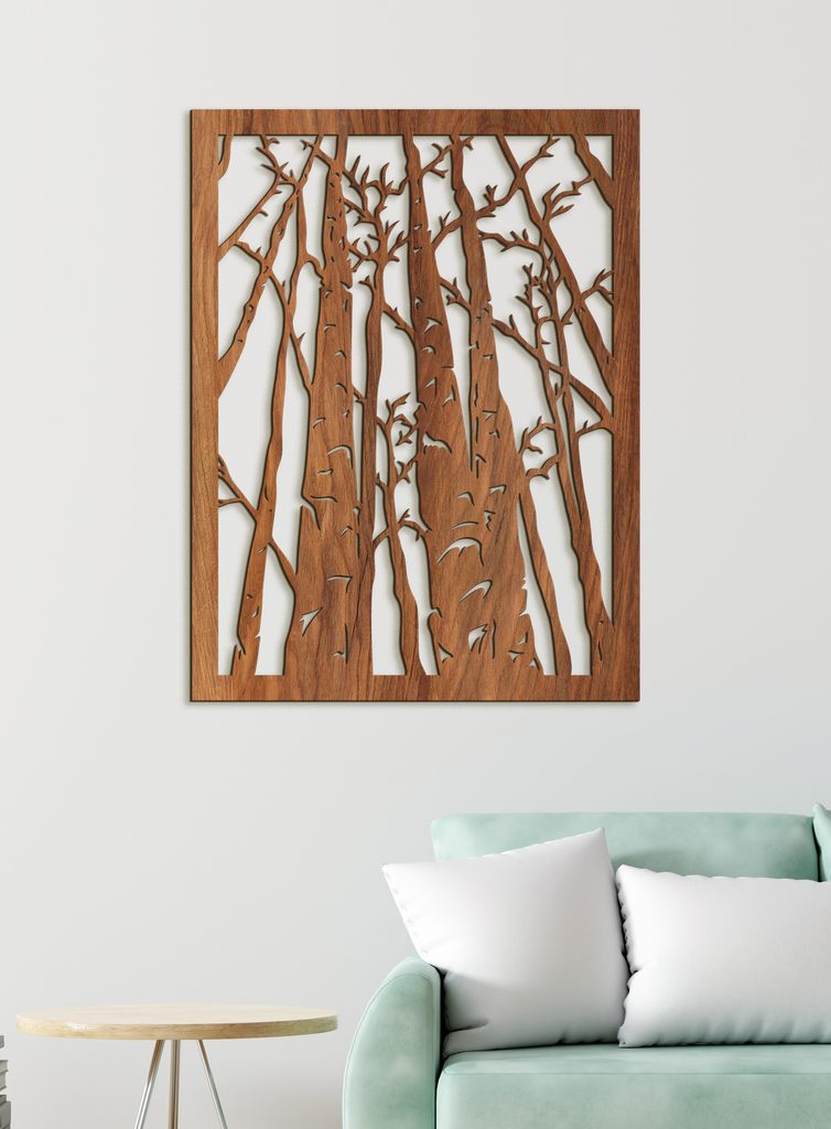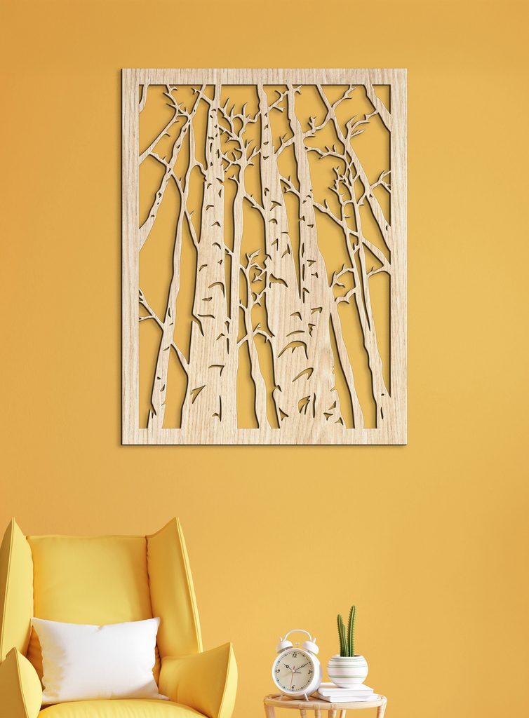 Nádherný drevený obraz zobrazuje siluetu hustého lesa s vysokými stromami bez lístia. Stromy sú prepracovane vyrezané, čo vytvára kontrast medzi drevom a pozadím a dodáva obrazu dojem hĺbky a tajomnej atmosféry. Rám, ktorý obklopuje obraz, dodáva celému dielu elegantný vzhľad.