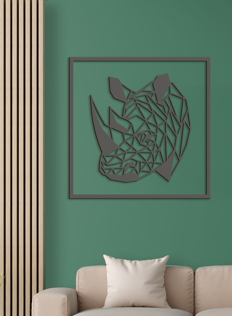 Tento dekoratívny drevený obraz na stenu zobrazuje štýlovú geometrickú siluetu nosorožej hlavy. Dizajn je starostlivo prepracovaný a skladá sa z rôznych tvarov, ktoré spolu vytvárajú moderné a abstraktné zobrazenie nosorožca.