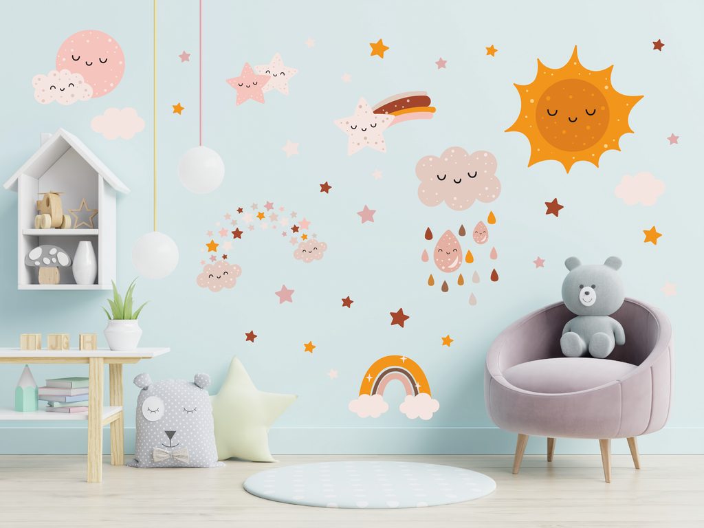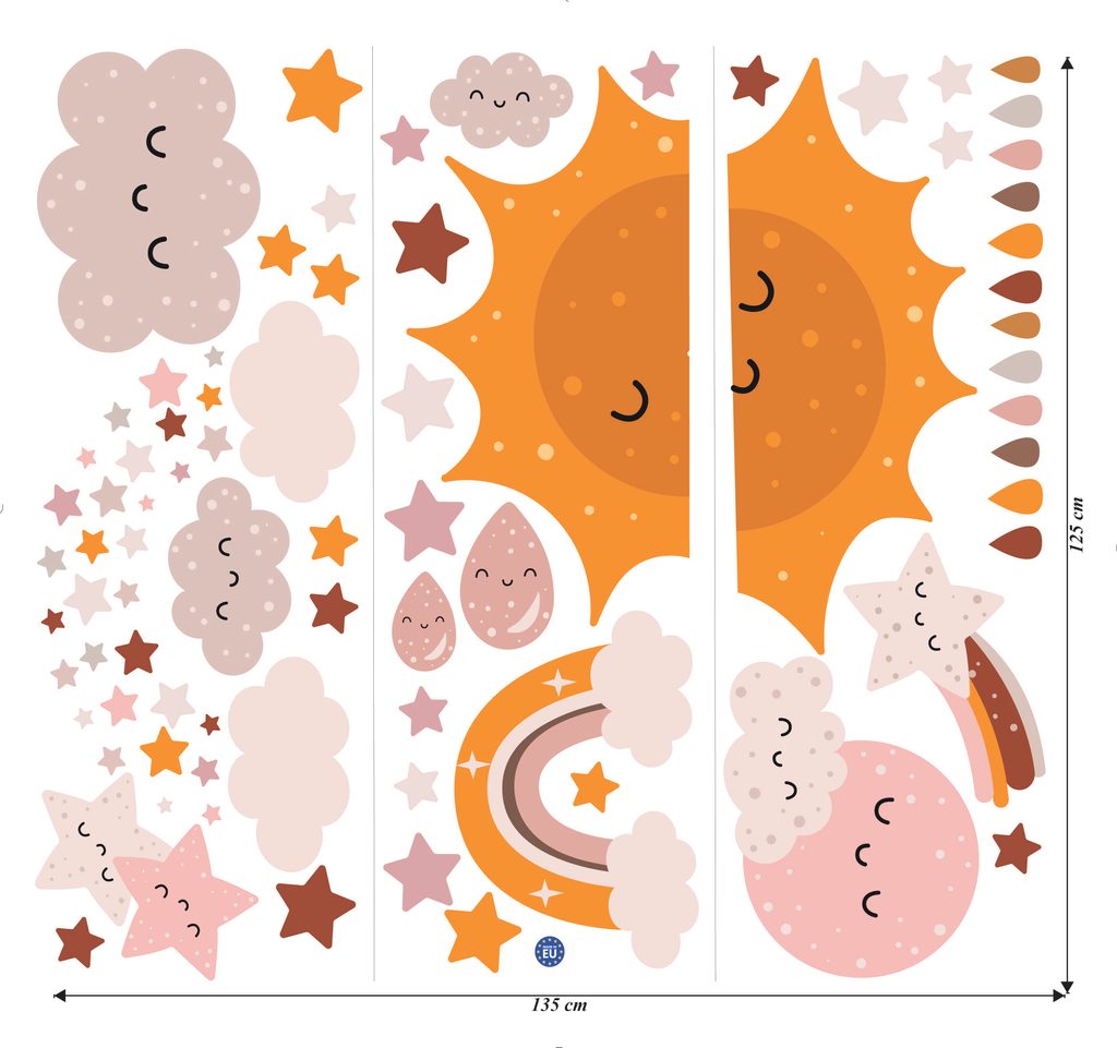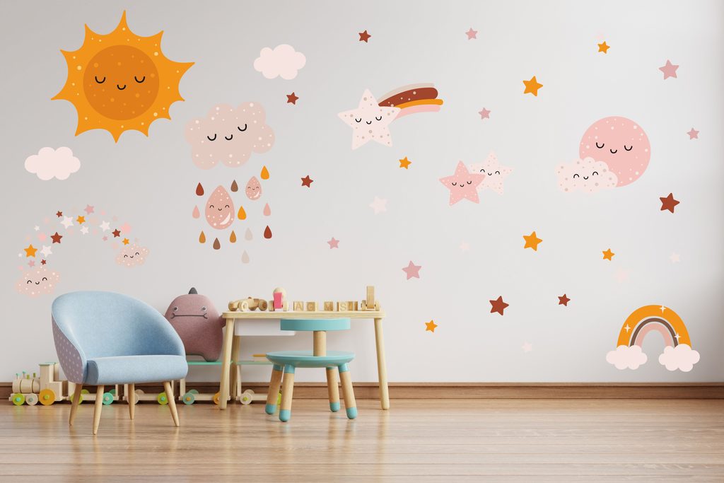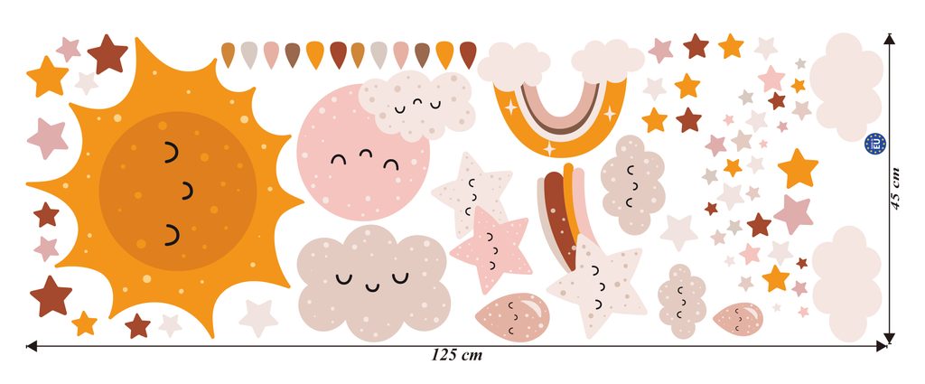 Vydajte sa s nami na dobrodružnú výpravu do vesmíru! Naše nálepky so slniečkom, mesiačikom, hviezdami a dúhou oživia každú detskú izbu. Nechajte svoju fantáziu zablúdiť medzi hviezdy a planéty.