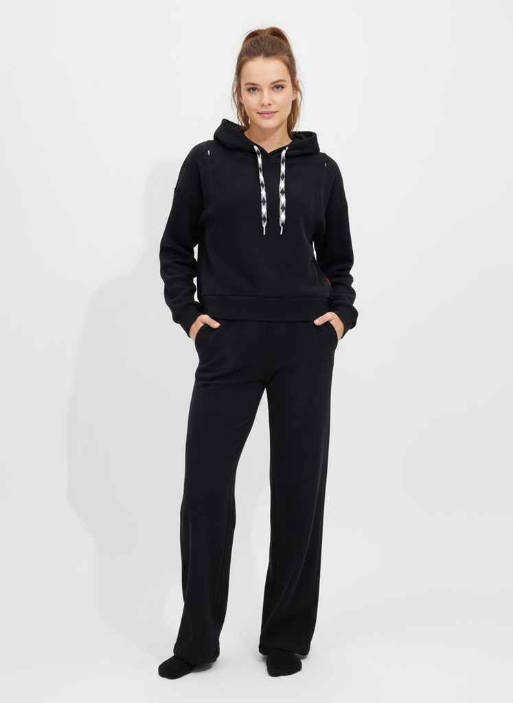 - tepláky: sťahovanie v páse šnúrkou, dve predné vrecká, ozdobné rebrovanie v páse