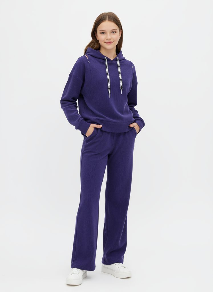 - tepláky: sťahovanie v páse šnúrkou, dve predné vrecká, ozdobné rebrovanie v páse