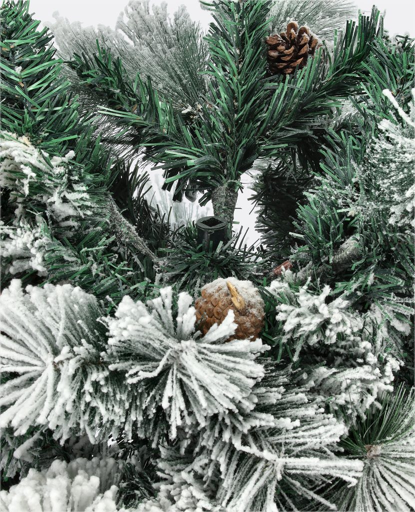 Jeho unikátnosť spočíva v hustých vetvičkách s dlhým ihličím a bohatým, bielym zasnežením, ktoré verne imituje čerstvo napadaný sneh. Zasneženie na vetvičkách vytvára ilúziu zasneženej borovice priamo z lesa a prináša do interiéru tú pravú vianočnú atmosféru. Stromček je navyše ozdobený prírodnými šiškami, ktoré podčiarkujú jeho autenticitu a dodávajú mu ešte pôsobivejší vzhľad.
